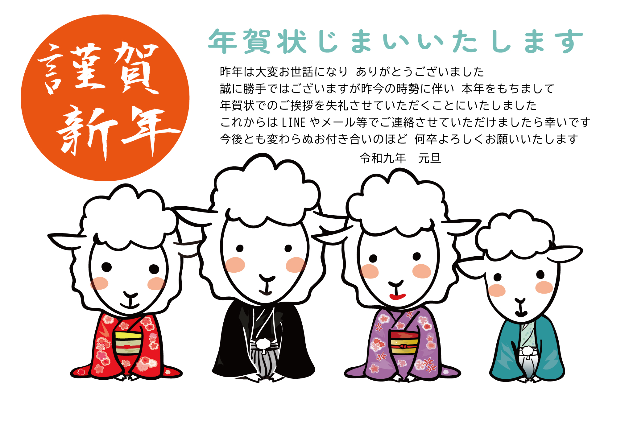 【年賀状じまい】テンプレート「未(ひつじ)」かしこまり羊ファミリーダウンロード