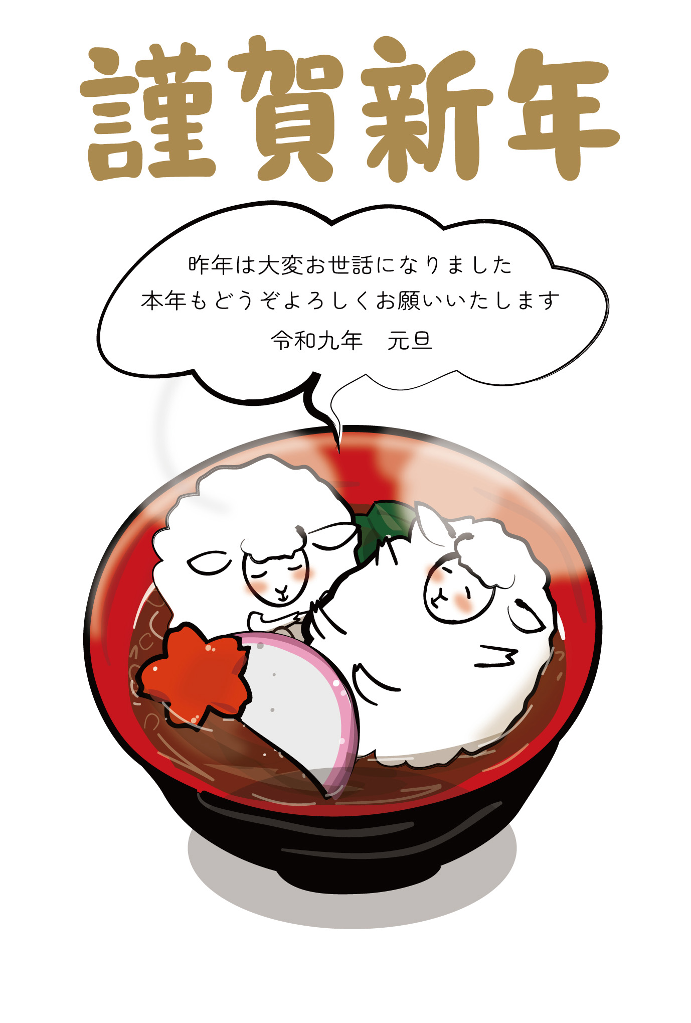 お雑煮にぷかぷか浮かぶ羊のほんわか年賀状テンプレート
