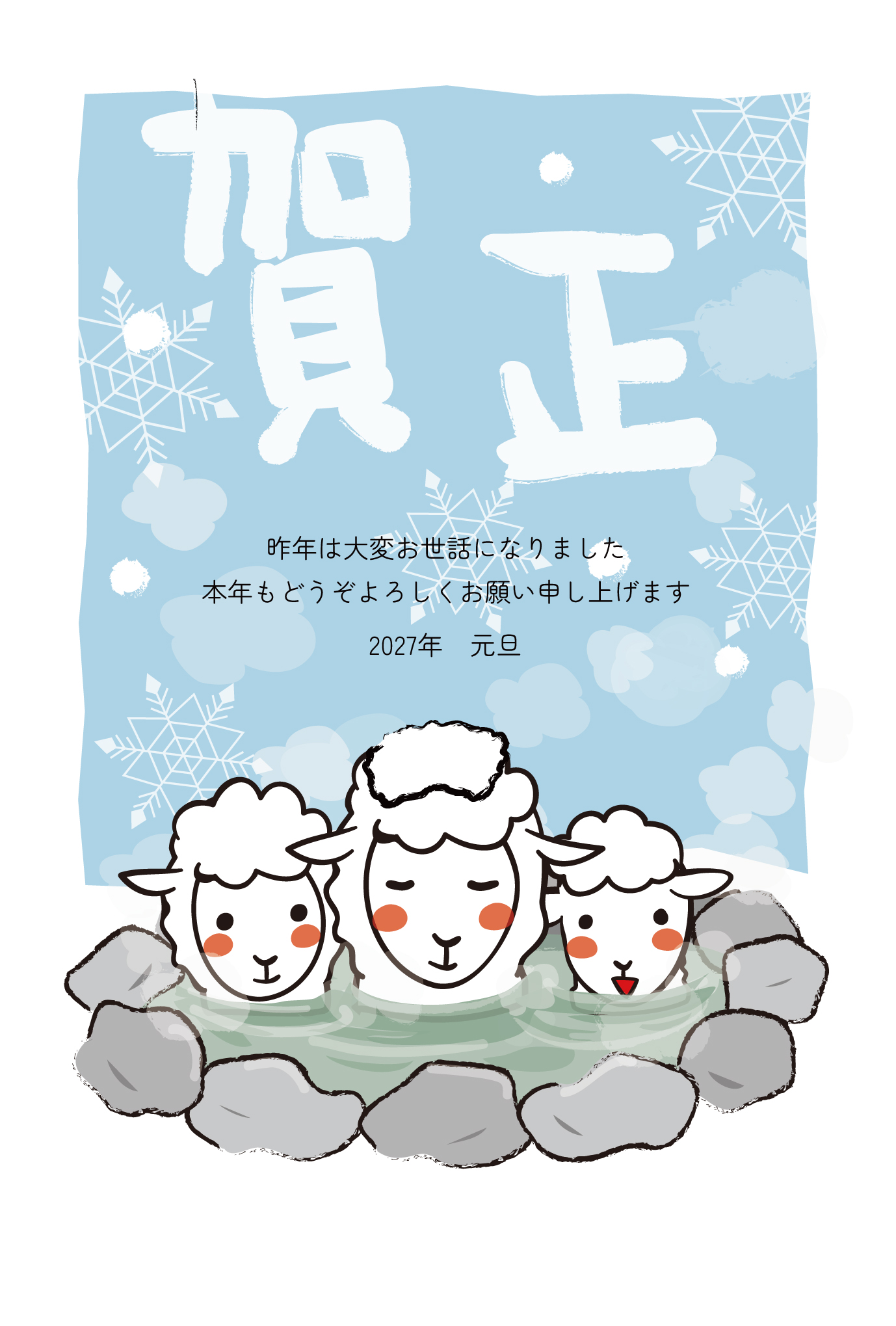 雪の中 温泉でほっこりする羊の家族の年賀状テンプレートです