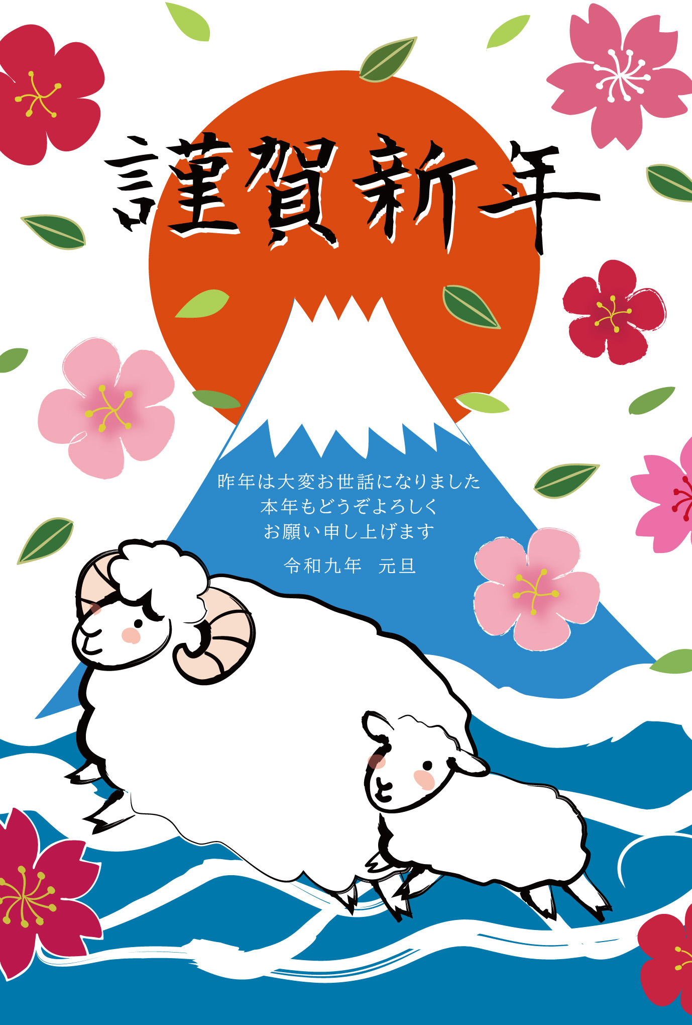 年賀状テンプレート「未(ひつじ)」富士山と白波と羊の親子ダウンロード