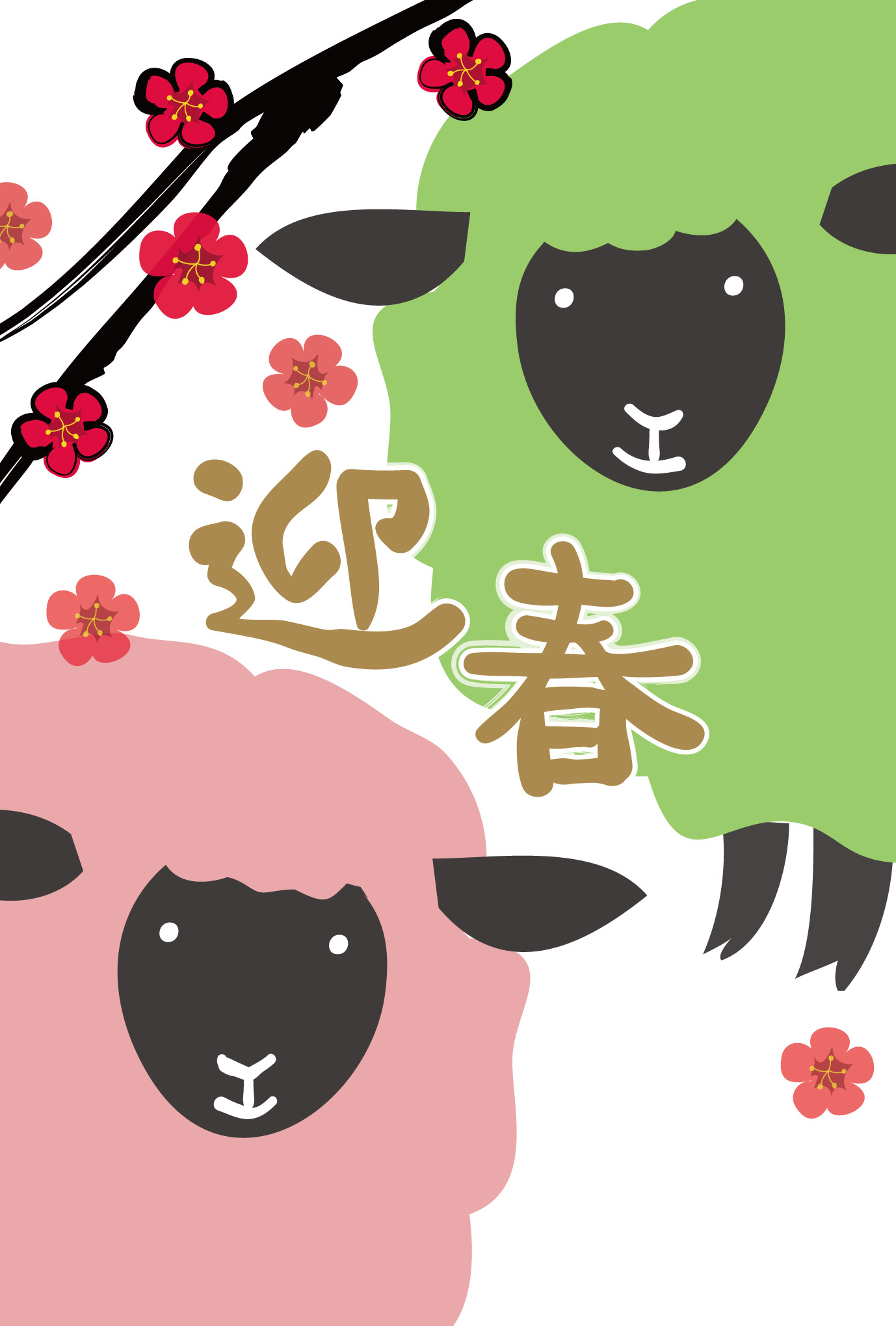 年賀状テンプレート「未(ひつじ)」カラフルな羊と梅ダウンロード