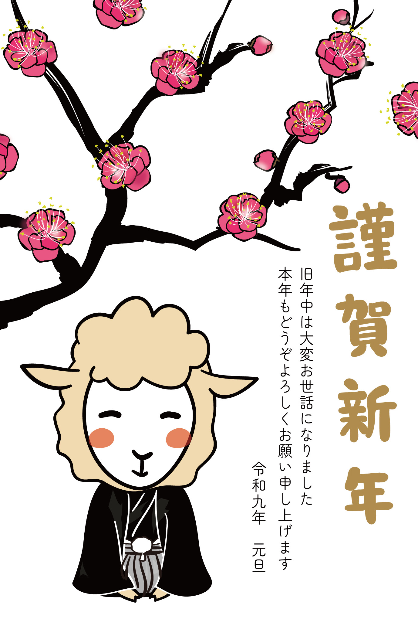 羽織袴でご挨拶の羊と和風の梅の年賀状テンプレートです