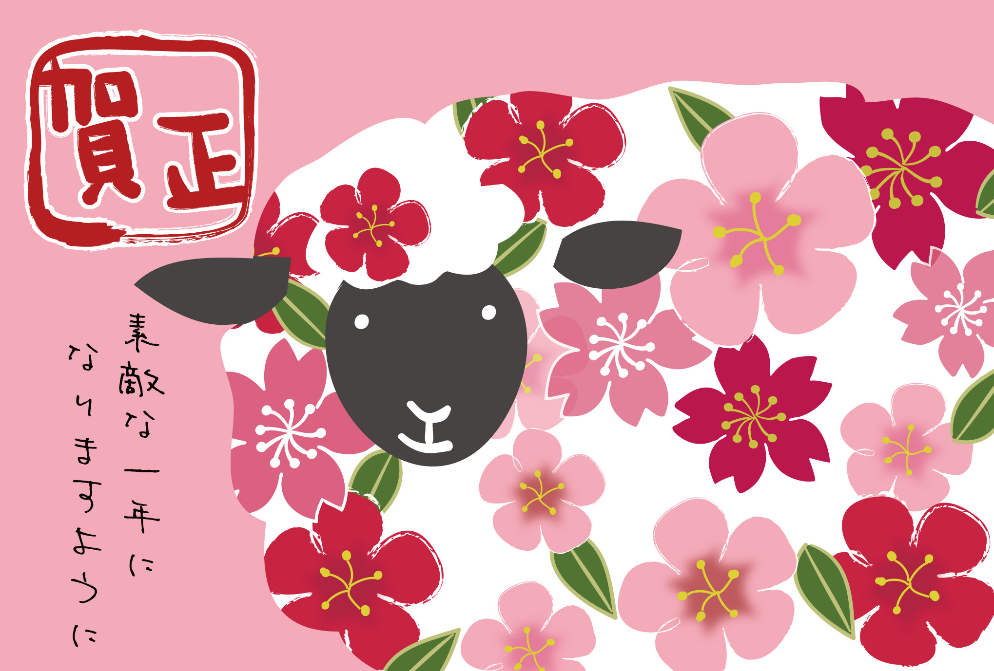 年賀状テンプレート「未(ひつじ)」お花模様の羊ダウンロード