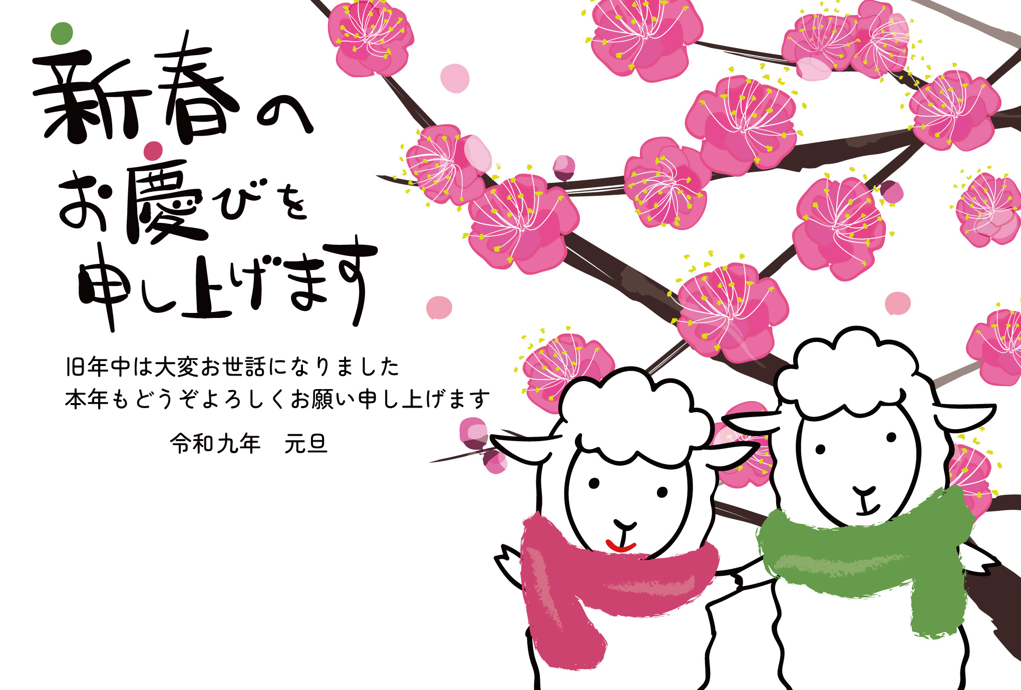 ピンクの梅とマフラーを巻いた羊カップルの華やかかわいい年賀状テンプレートです