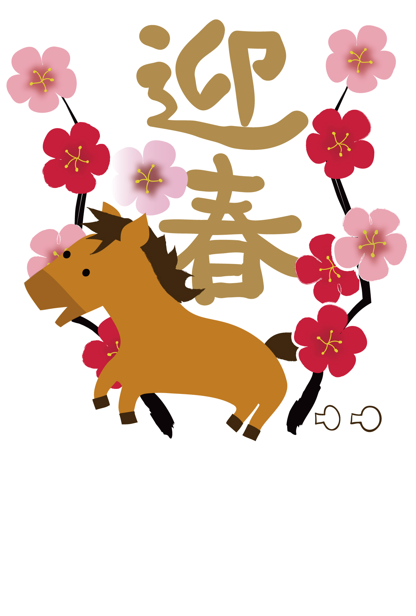 年賀状テンプレート「午(うま)」馬と華やかな梅ダウンロード
